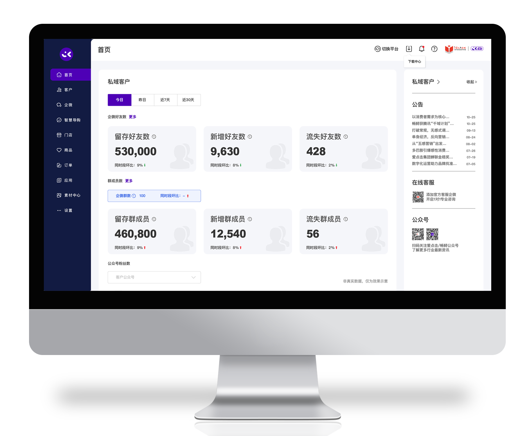 畅鲟为品牌搭建的SCRM运营平台,以导购为运营核心,整合企业微信能力,赋能品牌提升运营效率。